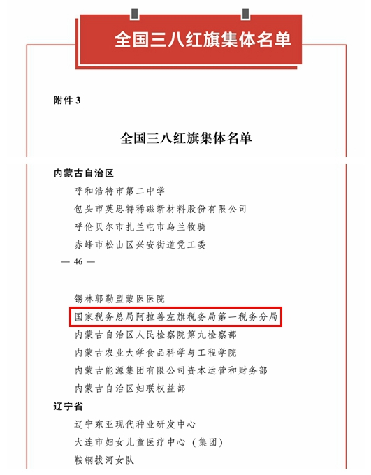 喜报!阿左旗税务局第一税务分局荣获“全国三八红旗集体”荣誉称号