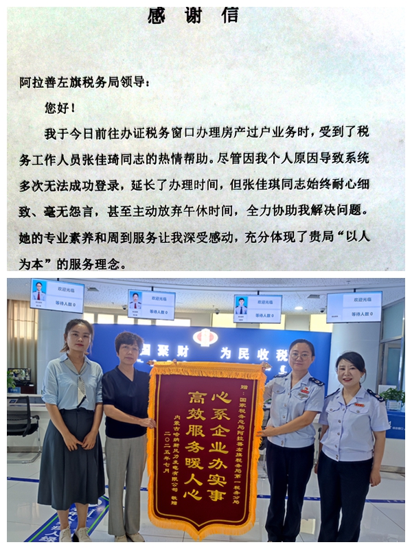 延时服务显担当,情暖人心解民忧。7月正值学区房过户高峰期,为满足广大家长急切的过户需求,阿左旗税务局不动产窗口工作人员主动开启“延时服务”模式。近一周以来,平均每日延时服务超过4小时,累计为150余户急需办理过户的家庭高效办结业务。其中,以张佳琦同志为代表的工作人员,主动延长服务时间,利用午间时段,耐心细致地为高龄老人、外地办事人员等特殊群体提供专属服务,其专业、热情与奉献精神深深打动了纳税人。7月28日,纳税人专程送来情真意切的感谢信,表达对工作人员和税务部门的由衷感谢与肯定。