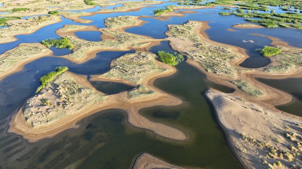 内蒙古杭锦旗呼和木独水生态呈现典型河网湿地景观。画面中蜿蜒水道与沙洲交错分布,深绿至浅蓝的水体折射出水质差异,沙洲上芦苇、柽柳等耐旱植被成簇生长,形成半干旱地区独特的生态过渡带。作为绿水青山实践创新基地的重要组成部分,该湿地正通过生态产业化路径,推动生态治理与民生改善协同发展,彰显荒漠化地区水生态修复的示范价值。(贺子轩)
