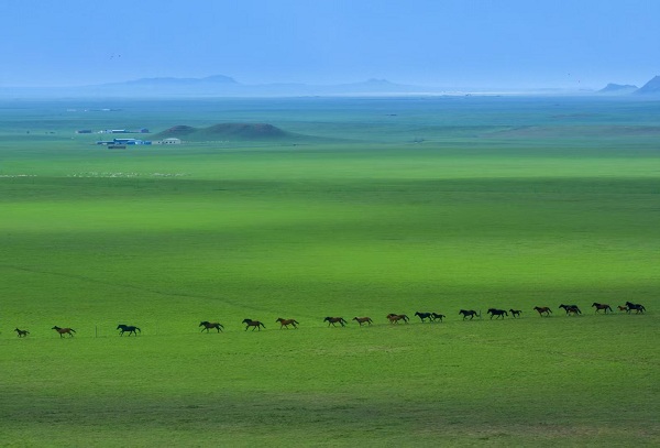 在鄂托克旗,广袤的绿色草原一望无际,一群骏马肆意奔腾,展现出草原的雄浑与生机,点缀其间的房屋、山丘与蓝天相映,更显草原的壮美辽阔。(图:张正国 文:高娜)