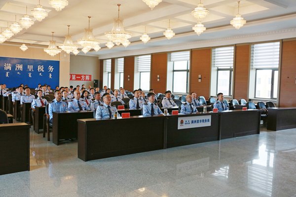 满洲里市税务局组织观看纪念中国人民抗日战争暨世界反法西斯战争胜利80周年大会直播