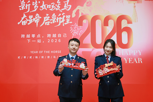 满洲里市税务局青年干部手持新年装饰,定格美好瞬间,以昂扬的精神风貌迎接新年到来,许下新一年扎根税务岗位、服务地方发展的初心誓言。(王美琦 摄)