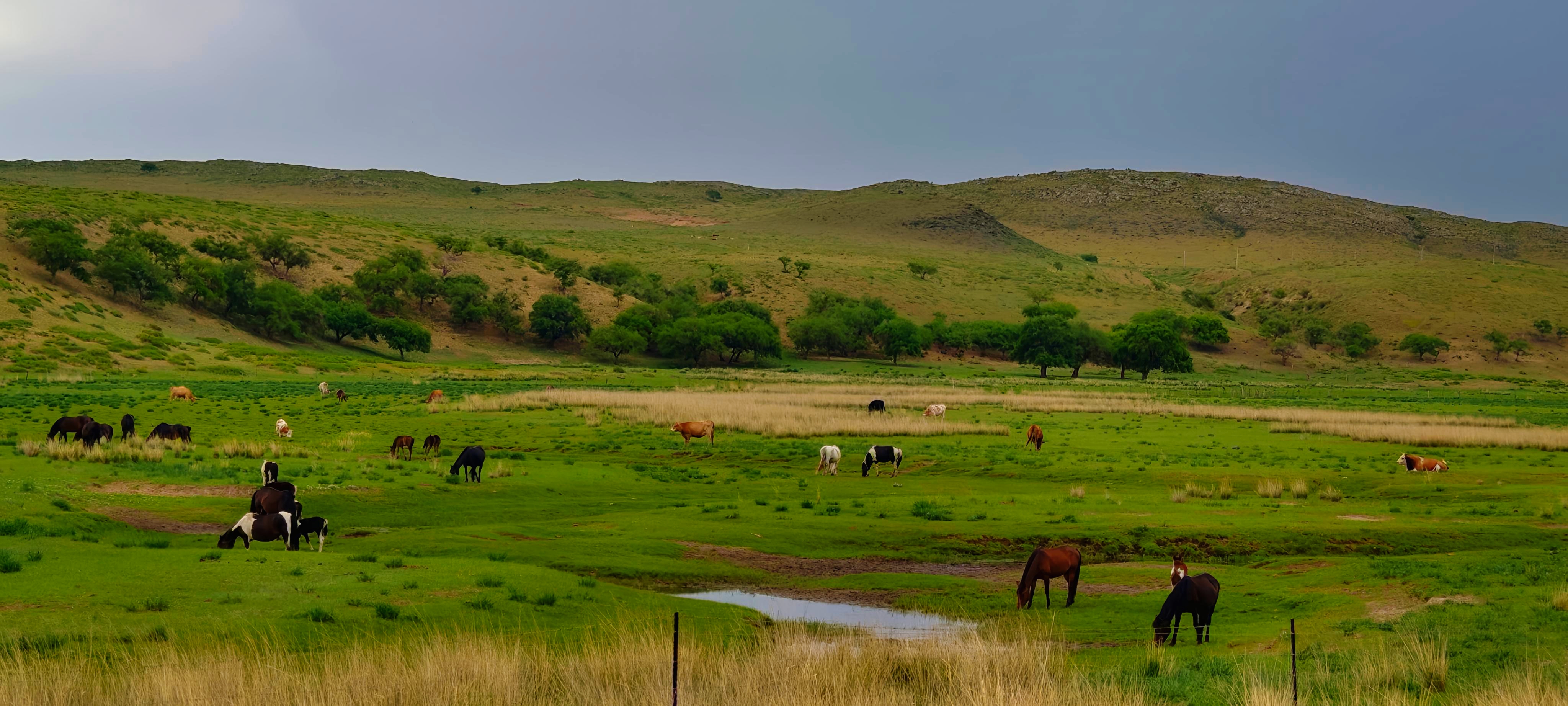 在广袤的白音锡勒牧场上,绿草如茵,马群悠然,远处起伏的山丘与茂密的林木相映成趣,展示了一幅草原上独有的壮美秋日景观。(包国华 摄)