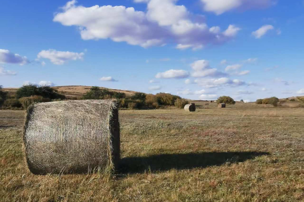 正值草原打草季,几卷圆形的草垛静静伫立,草色黄绿相间,尽显秋日独特韵味。(钟 瑶 摄)
