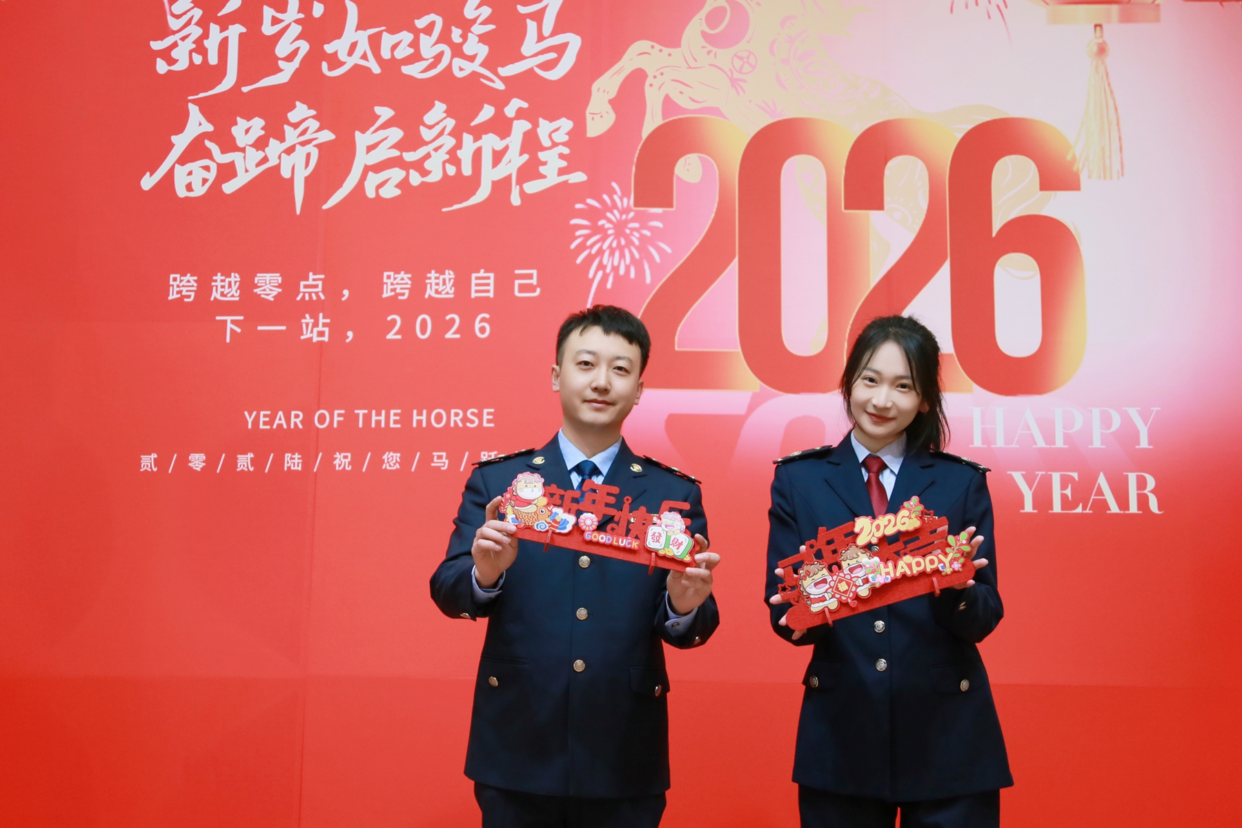 在巴彦淖尔市,五原县税务部门青年干部手持红灯笼、小国旗与福字装饰,开展拍摄新年主题合影活动,以青春之姿迎接2026年的到来,以更饱满的热情投身税收工作。(李佳颖 摄)
