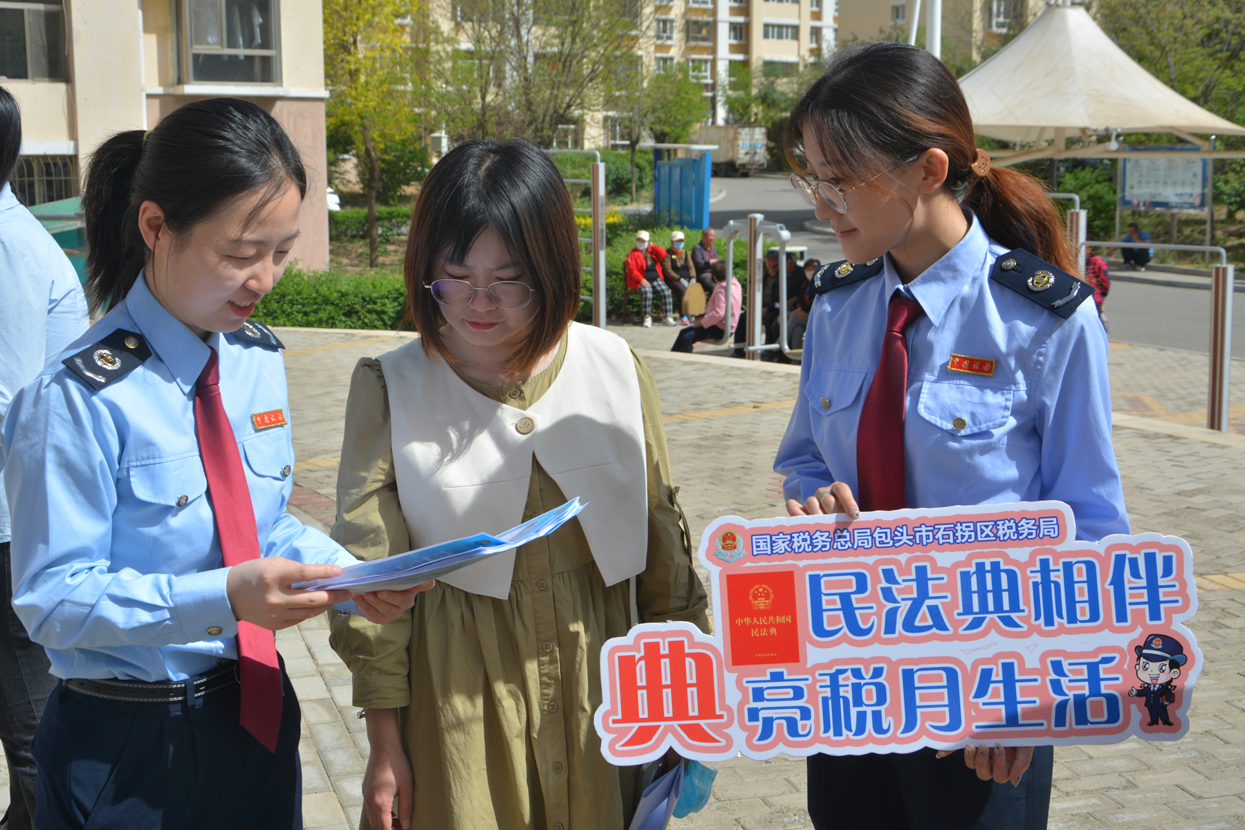 在包头市,石拐区税务部门在社区设置宣传站点,结合民法典典型案例,为居民群众普及相关法律法规。(陈茹静 摄)