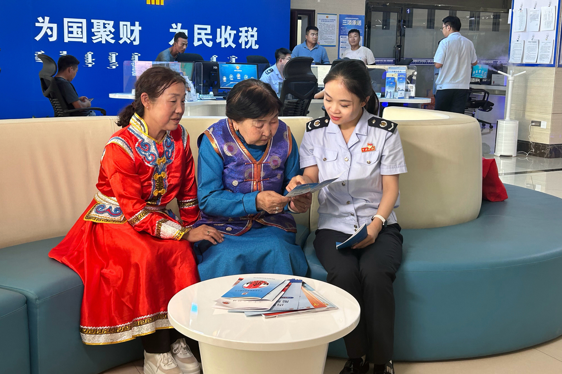 在内蒙古阿拉善高新技术产业开发区税务局,工作人员为少数民族纳税人缴费人送上“法治清风”,让民法典和税费政策走入少数民族群众当中。(李遥 摄)