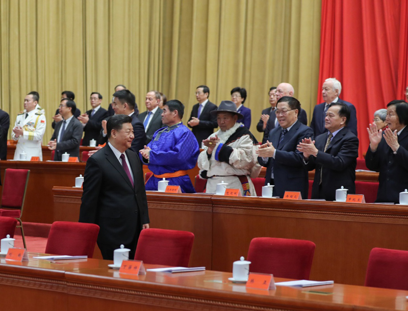 12月18日,庆祝改革开放40周年大会在北京人民大会堂隆重举行。中共中央总书记、国家主席、中央军委主席习近平在大会上发表重要讲话。这是习近平、李克强、栗战书、汪洋、王沪宁、赵乐际、韩正、王岐山等领导同志步入会场。新华社记者 谢环驰 摄