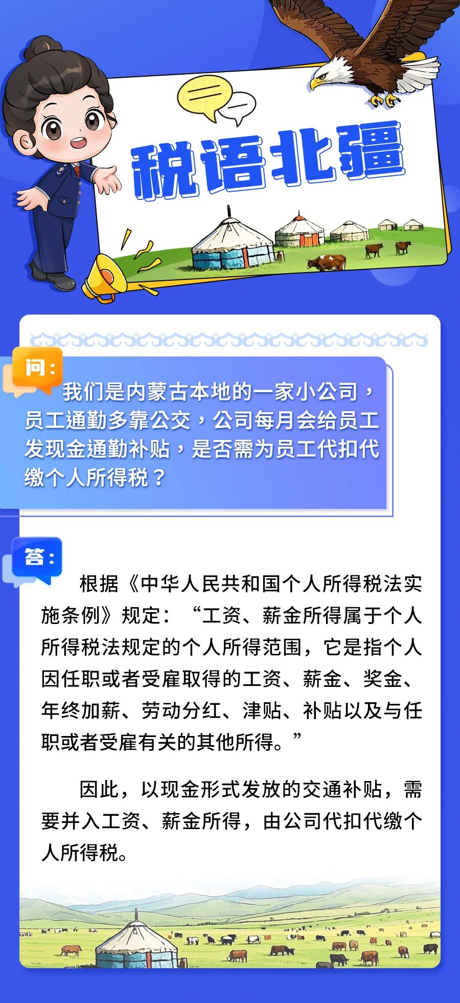 我们是内蒙古本地的一家小公司,员工通勤多靠公交,公司每月会给员工发现金通勤补贴,是否需为员工代扣代缴个人所得税?